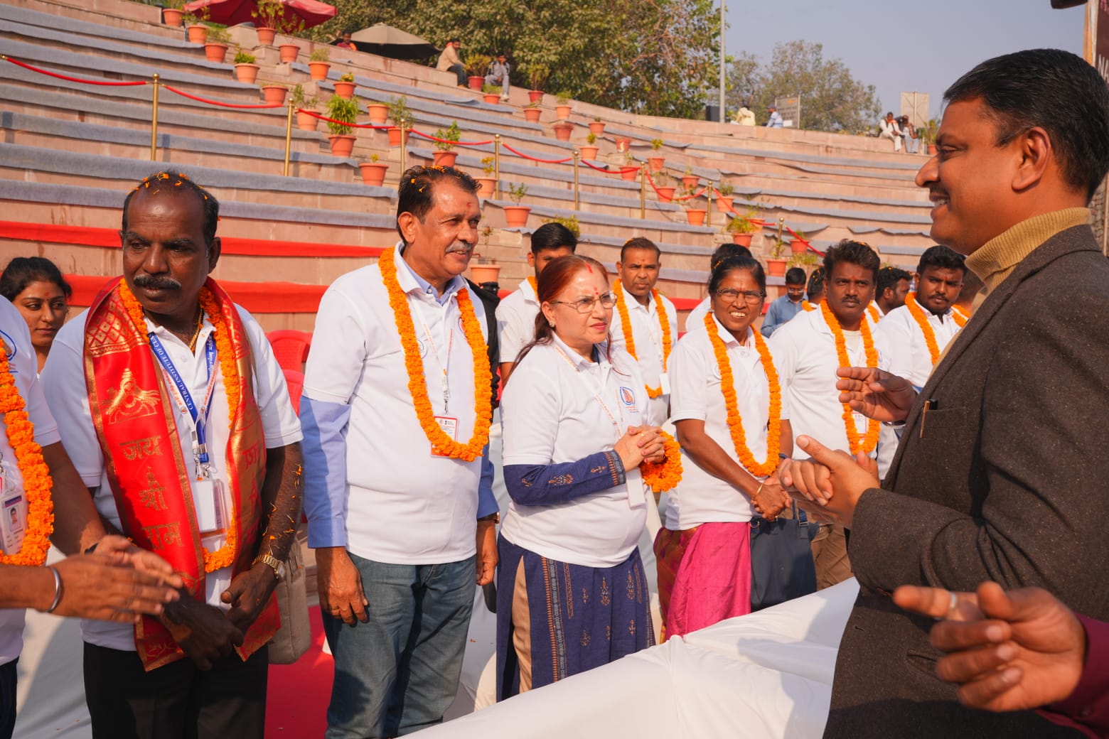 रैली में शामिल 15–20 वाहनों और लगभग 100 प्रतिभागियों का भव्य स्वागत मोहन सराय काशी द्वार पर किया गया, जहां एमएलसी हंसराज विश्वकर्मा सहित सैकड़ों कार्यकर्ताओं एवं नागरिकों ने पुष्पवर्षा और माल्यार्पण कर अगवानी की। इसके बाद नमो घाट पर पहुँचने पर मंडलायुक्त, वाराणसी मण्डल, श्री एस. राजलिंगम (आईएएस) और जिलाधिकारी श्री सत्येन्द्र कुमार (आईएएस) ने दल का औपचारिक स्वागत किया।